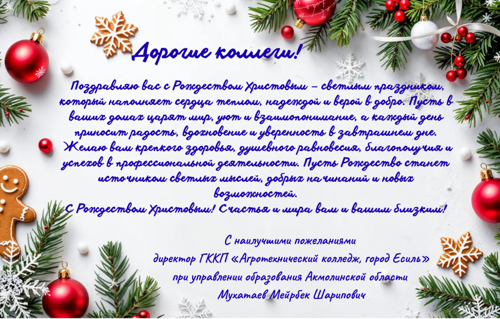 Сіздерді Рождество мерекесімен - жүректерді жылумен, үмітпен және игілікке деген сеніммен толықтыратын жарқын мерекемен құттықтаймын. Сіздердің үйлеріңізде бейбітшілік, жайлылық пен өзара түсіністік орнасын, ал күн сайын қуаныш, шабыт пен ертеңгі күнге деген сенім әкелсін.